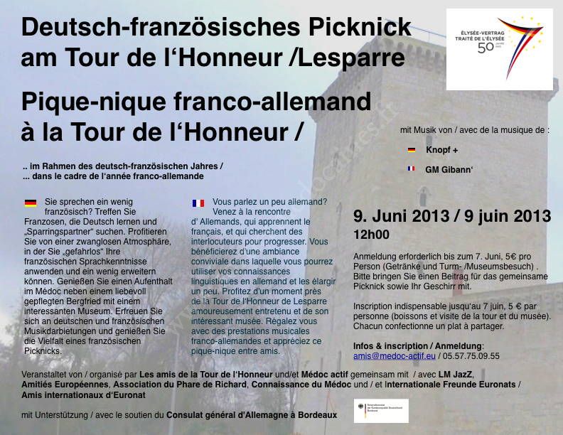 Profitez d'un moment près de la Tour de l‘Honneur de Lesparre amoureusement entretenu et de son intéressant musée. Régalez vous avec des prestations musicales franco-allemandes et appréciez ce pique-nique entre amis.