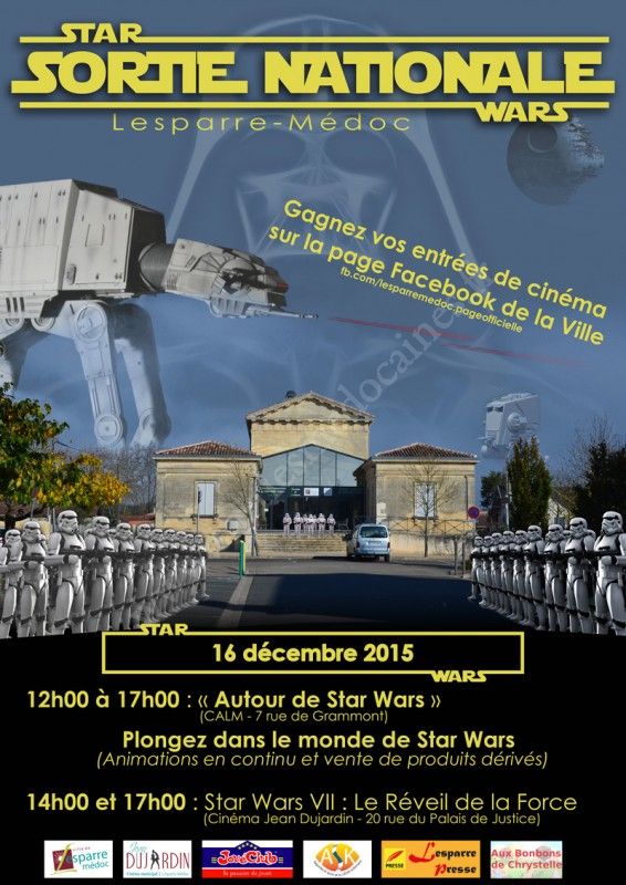 A l'occasion de la Sortie Nationale du film "Star Wars VII : Le Réveil de la Force", la Ville de Lesparre-Médoc organise le 16 décembre un salon "Autour de Star Wars", de 12h00 à 17h00 au Centre d'Animations de Lesparre-Médoc (CALM).