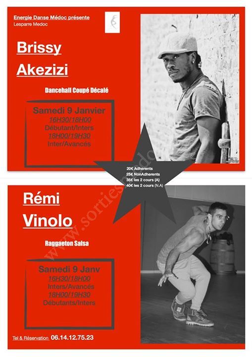 Stage de Salsa/Coupé Décalé à l’école de danse « Energie Danse Médoc » à LESPARRE. Stage de Dancehall Coupé Décalé avec Brissy Akezizi de 16h30 à 18h pour les débutants/inters et de 18h à 19h30 pour les inters/avancés. Stage de Raggaeton Salsa avec Rémi Vinolo de 16h30 à 18h pour les inters/avancés et de 18h à 19h30 pour les débutants/inters. Tarifs : 20€/cours adhérents, 25€/cours non adhérents, 35€/les 2 cours adhérents et 40€/les 2 cours non adhérents.