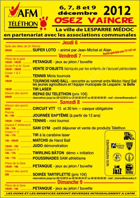 Du jeudi 6 au dimanche 9 décembre 2012, Lesparre-Médoc vit à l'heure du Téléthon avec pour devise cette année, "Osez vaincre".