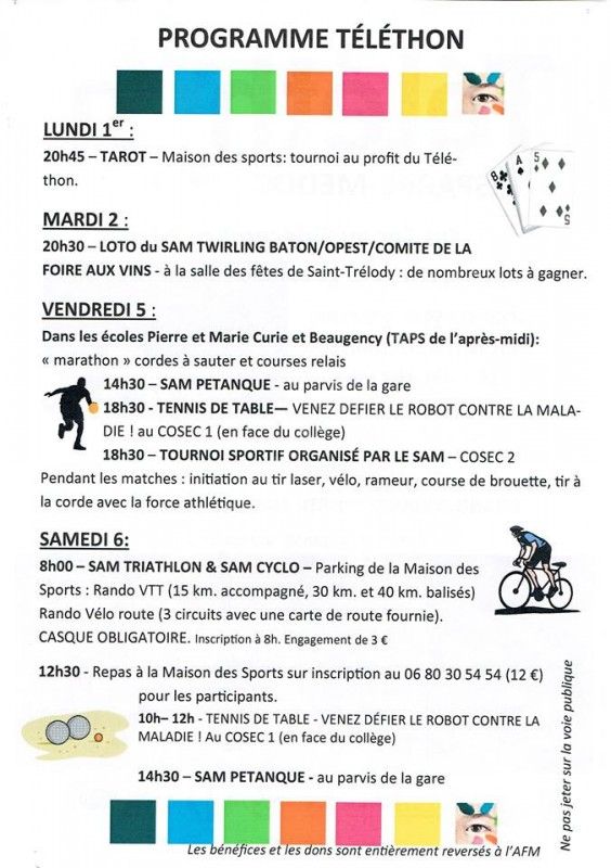 - 20h45 : TAROT - Maison des sports: tournois au profit du Téléthon.