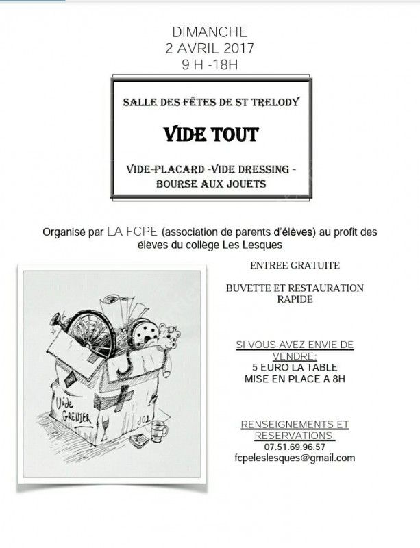 Vide tout, vide placard, vide dressing, bourse aux jouets organisé par LA FCPE (association des parents d'élèves) au profit des élèves du collège Les Lesques.