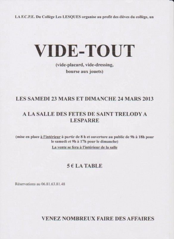La F.C.P.E. du Collège Les Lesques organise au profit des élèves du collège, un Vide-Tout (vide-placard, vide-dressing, bourse aux jouets).