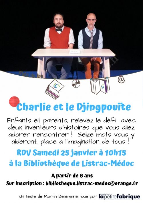Le spectacle que vous allez découvrir est un défi lancé à deux inventeurs d’histoires. Ils vont recevoir devant vous 16 mots ; les lire à voix haute et vous les faire entendre, soyez attentifs. Ils devront ensuite inventer sous vos yeux une histoire mais pas n’importe laquelle, l’histoire de Charlie et le Djingpouite. Aucune limite à l’invention, tout est permis ! La seule règle, utiliser ces 16 mots : AMOUREUSEMENT, AVANCER, AVENTURE, BIBLIOTHÉCAIRE, CHEVEUX, DEUX, DICTIONNAIRE, DISPARAÎTRE, DUNE, ENDORMIR, HUITRE, PISTE, PROUT, SAVANTE, TROUPEAUX, VENT.