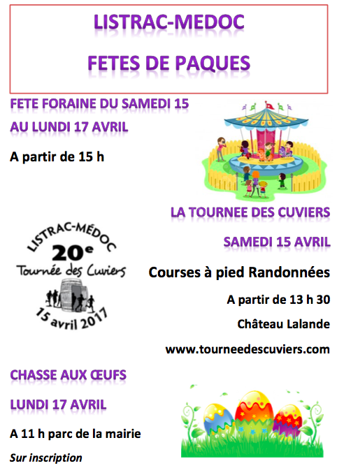 - Lundi 17 avril : Chasse aux oeufs à 11h00 dans le parc de la mairie