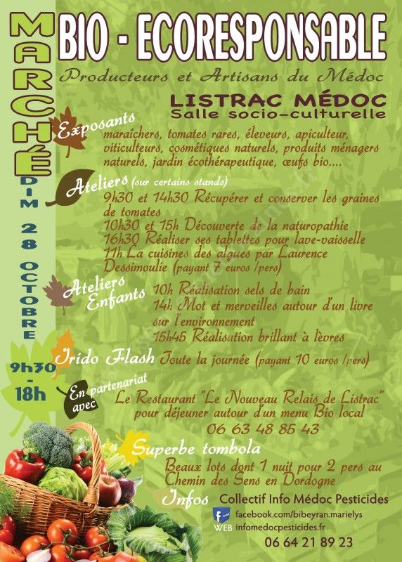 Marché réunissant une vingtaine de producteurs et artisans bio et éco-responsables du Médoc, maraîchers, spécialiste des tomates rares et anciennes et des semences paysannes, productrice plantes aromatiques et médicinales, éleveurs, viticulteurs, cosmétiques adultes et enfants, jardin éco-thérapeutique, naturopathe, cuisinière éco-responsable, apiculteur.