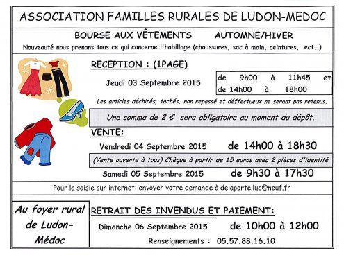 - Dépôt : jeudi 3 septembre 2015 de 9h00 à 11h45 et de 14h00 à 18h00 (Les articles déchirés, tâchés, non repassé et défectueux ne seront pas retenus) - Une somme de 2€ sera obligatoire au moment du dépôt