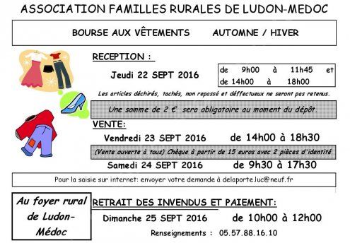 - Dépôt : jeudi 22 septembre 2016 de 9h00 à 11h45 et de 14h00 à 18h00 (Les articles déchirés, tâchés, non repassé et défectueux ne seront pas retenus) - Une somme de 2€ sera obligatoire au moment du dépôt