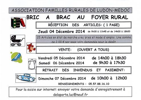 Bric à brac organisé par l'Association Familles Rurales de Ludon.