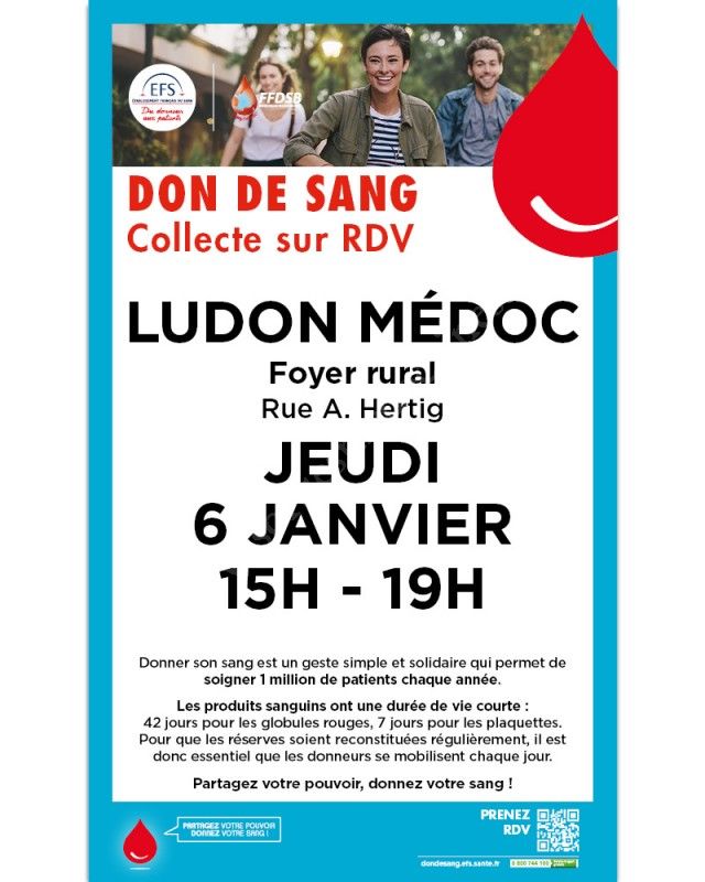 Venez donner votre sang le jeudi 6 janvier 2022 à Ludon, vous sauverez ainsi des vies !