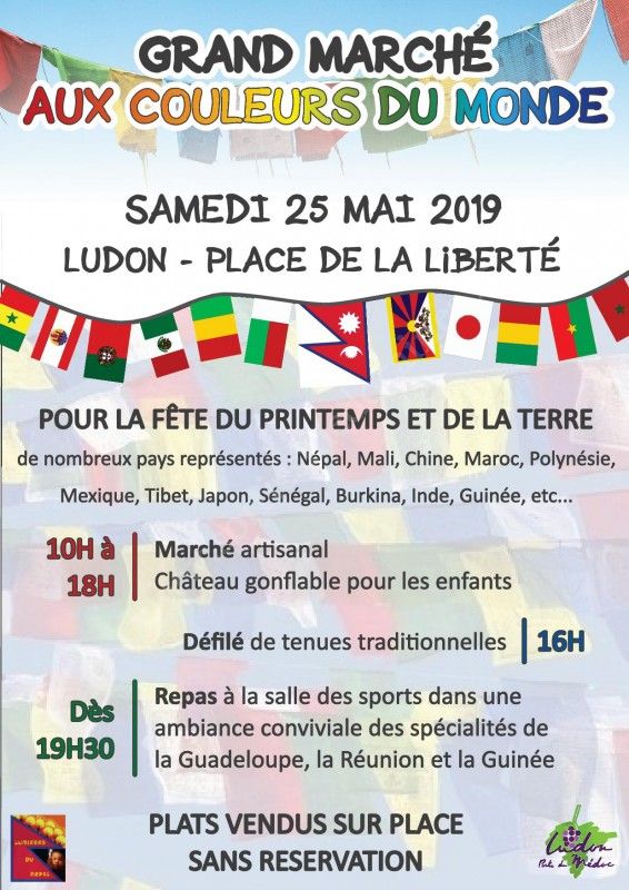 Dans le cadre de la Fête du Printemps et de la Terre à Ludon Médoc, le samedi 25 mai, aura lieu un Marché aux Couleurs du monde avec une vingtaine de pays représentés, Maroc, Sénégal, Burkina, Japon, Chine, Polynésie, Tibet, Mexique, Népal ... organisé par l'association Lumières du Népal.