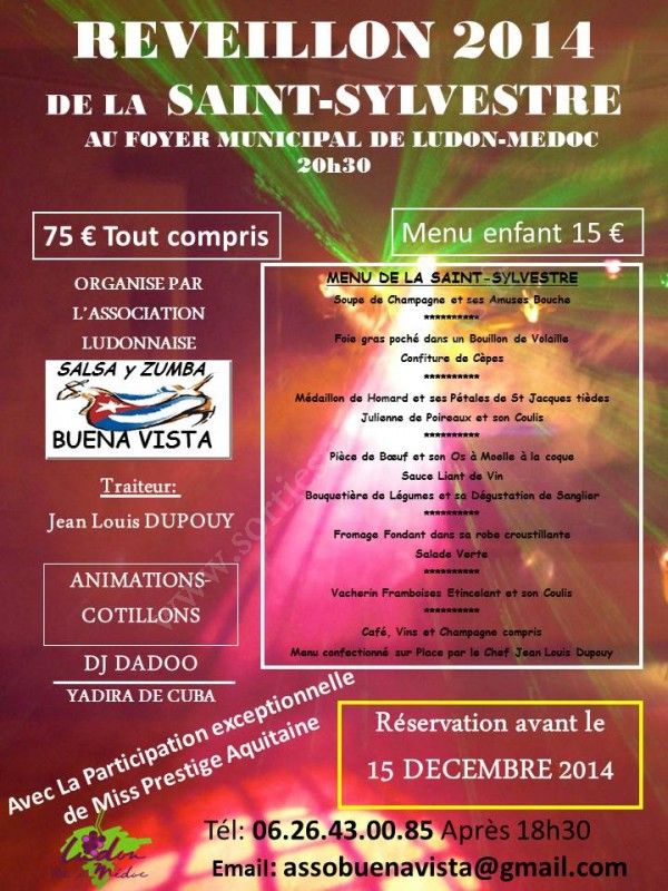 Buena Vista, l’association ludonnaise de Salsa et Zumba organisera le réveillon de la Saint Sylvestre 2014 à Ludon Médoc avec une nouvelle fois la volonté de vous proposer un réveillon de qualité.
