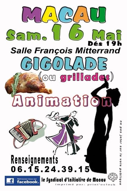Gigolade ( gigot de mouton roti à la ficelle à la braise) ou faux filet de boeuf grillé, flageolets vert ou pommes chips,fromage un verre de vin rouge,rosé ou jus d'orange.