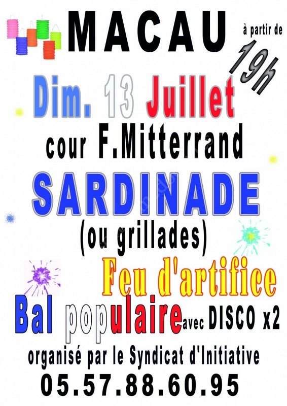 Le syndicat d'initiative de Macau organise une soirée sardines ou grillades de porc à la braise, pommes vapeur, fromage, vin rouge ou rosé (9€/pers. et 6€ pour les moins de 12 ans)