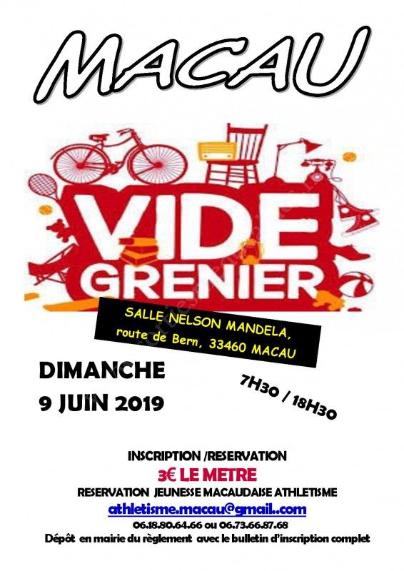 Toute l'équipe de la Jeunesse Macaudaise Athlétisme, vous invite à venir participer à son vide grenier qui aura lieu le Dimanche 9 juin 2019 sur le complexe de la salle Nelson Mandela à Macau. Le site sera ouvert à partir de 6h et la fin de la manifestation est prévue à 18h30.