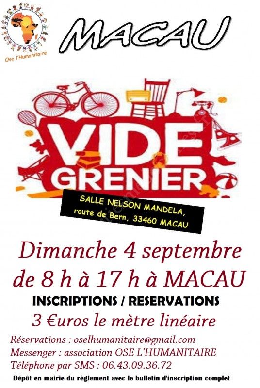 L'association OSE L'HUMANITAIRE organise son traditionnel Vide Grenier dans le grand espace autour de la salle Nelson Mandela à Macau.