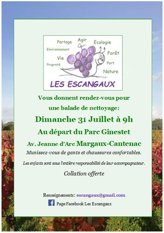 Que vous veniez découvrir Margaux-Cantenac et que vous soyez Margalais-Cantenacais, venez vous balader avec nous durant une heure tout en ramassant quelques déchets.