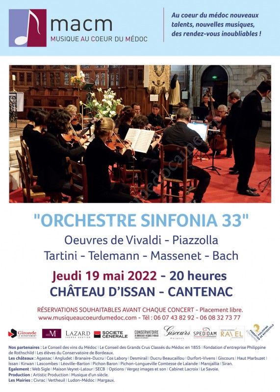 L’association Musique au Coeur du Médoc (MACM), s’est donné pour mission de mettre en scène les jeunes comme les plus grands talents de la musique classique en organisant chaque saison dans les hauts lieux du vin et du patrimoine médocain des concerts prestigieux et un concours international de chant des châteaux “Bordeaux Médoc Lyrique” à l’Opéra de Bordeaux.