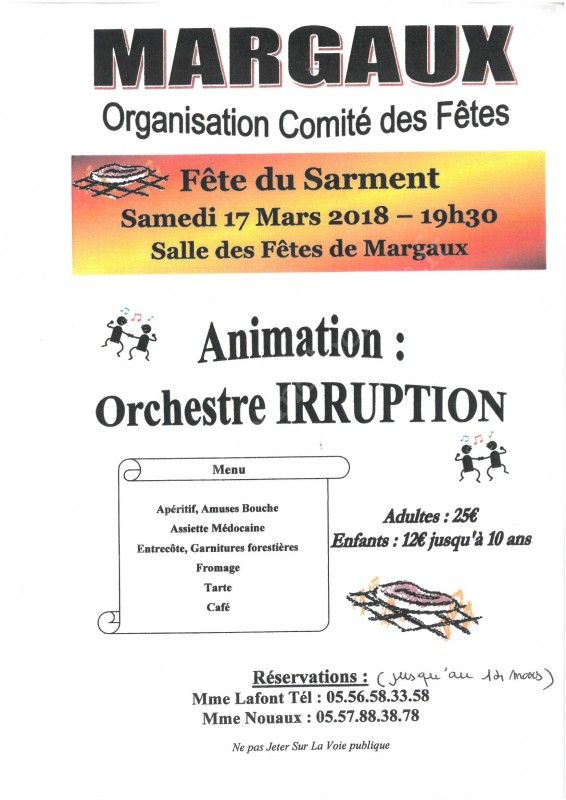 organisation comite des fêtes - samedi 17 mars 2018 à la salle des fêtes de Margaux