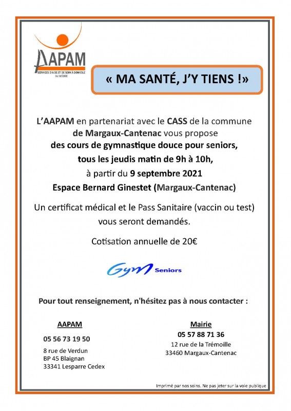 L’AAPAM en partenariat avec la commune de Margaux-Cantenac vous propose des cours de gymnastique douce pour seniors, tous les jeudis matin.