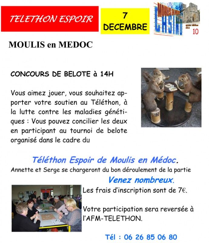 Vous aimez jouer, vous souhaitez apporter votre soutien au Téléthon, à la lutte contre les maladies génétiques : Vous pouvez concilier les deux en participant au tournoi de belote organisé dans le cadre du Téléthon Espoir de Moulis en Médoc.