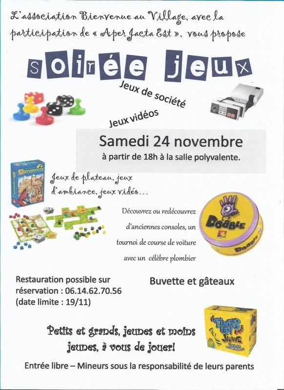 L'association Bienvenue au Village propose une soirée conviviale et animée pour découvrir ou redécouvrir le plaisir de jouer ensemble!!