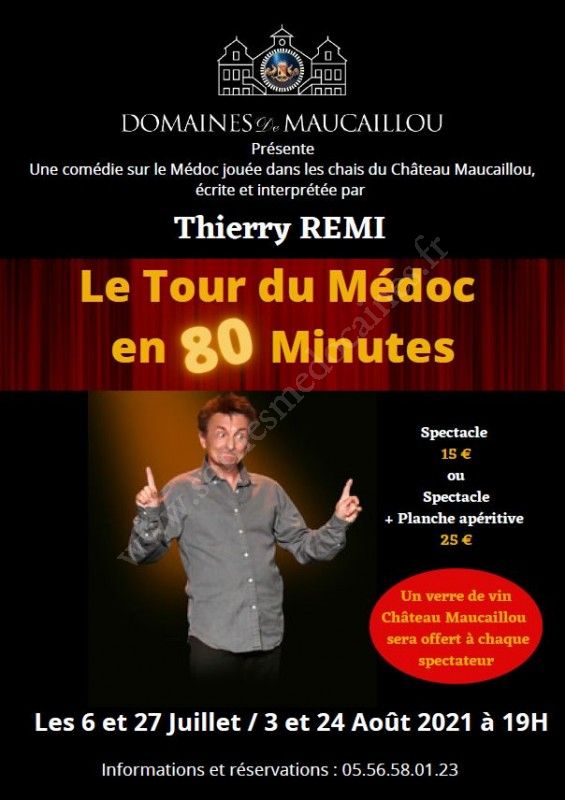 Venez découvrir cette presqu’île du Médoc et ses habitants à travers la comédie intitulée : « Le Tour du Médoc en 80 min » écrite et interprétée par Thierry REMI et jouée au cœur du Cuvier du Château Maucaillou…