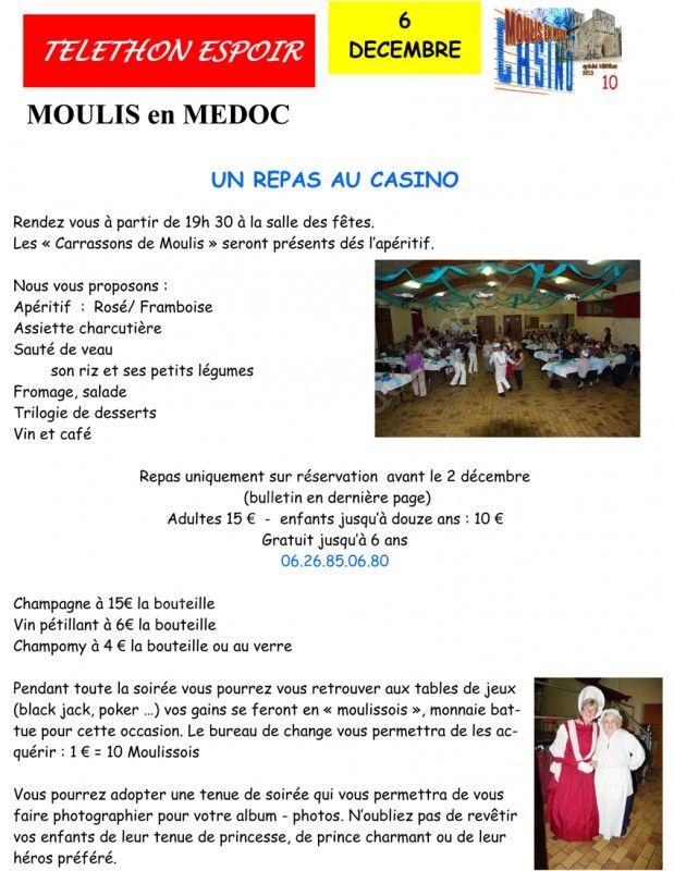 Pendant toute la soirée vous pourrez vous retrouver aux tables de jeux (black jack, poker …) vos gains se feront en « moulissois », monnaie battue pour cette occasion. Le bureau de change vous permettra de les acquérir : 1 € = 10 Moulissois.