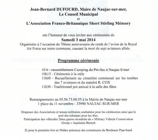 ont l'honneur de vous inviter aux cérémonies du samedi 03 mai 2014 organisées à l'occasion du 70ème anniversaire du crash de l'avion de la Royal Air Force sur la commune, causant la mort de sept aviateurs alliés.