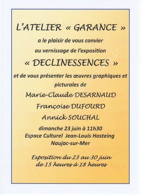 L'Atelier "Garance" vous convie à son exposition "Declinessences" et vous présentera les oeuvres graphiques et picturales de :