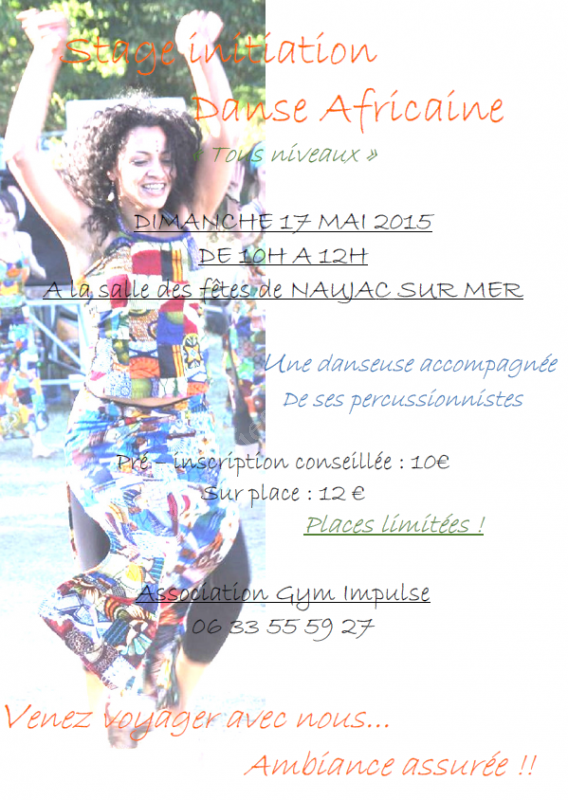 Stage d'initiation à la danse Africaine tous niveaux animé par une danseuse et ses percussionistes.
