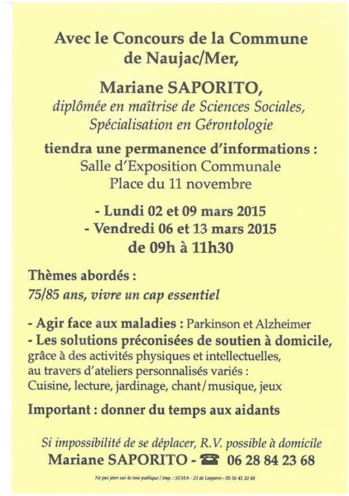Avec le concours de la Commune de Naujac-sur-Mer, Mariane Saporito, diplômée en maîtrise de Sciences Sociales, Spécialisation en Gérontologie, tiendra une permanence d'informations.