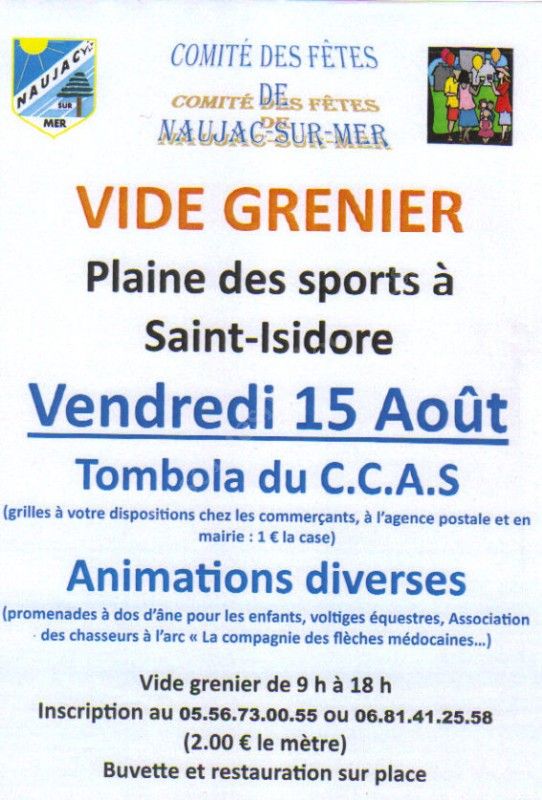 le comité des fêtes de naujac sur mer organise un vide grenier à la plaine des sports de saint-isidore.