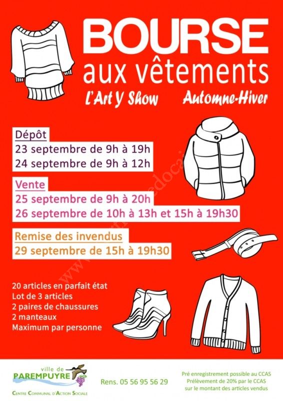 - Dépôt des vêtements (20 articles, lot de 3 articles, 2 paires de chaussures et 2 manteaux maximum par personne) : mercredi 23 de 9h00 à 19h00 et jeudi 24 de 9h00 à 12h00.