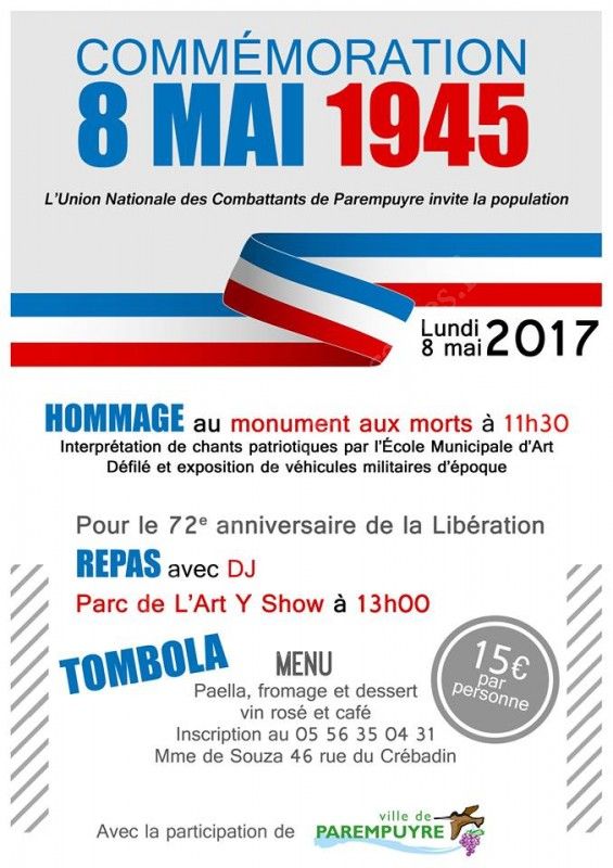 Participez aux cérémonies de commémoration de l'anniversaire de l'armistice du 8 mai 1945 et au défilé de véhicules militaire d'époque, rendez-vous le 8 mai 2017 à 10h15 au cimetière pour le dépôt de gerbe, à 10h30 à l'église pour célébrer la Messe,