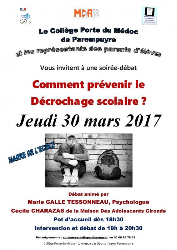 L'association RPEP / Regroupement des Parents des Ecoles de Parempuyre et le Collège organisent jeudi 30 mars 2017 une conférence débat. Après avoir abordé en 2015 le thème des "Relations parents ados", puis en 2016 celui de la "Réussite scolaire" avec le Docteur TEDO, nous traiterons cette année du "Décrochage scolaire" avec Marie GALLE TESSONNEAU, Psychologue à Bordeaux et ce en partenariat avec la Maison des Adolescents de Gironde.