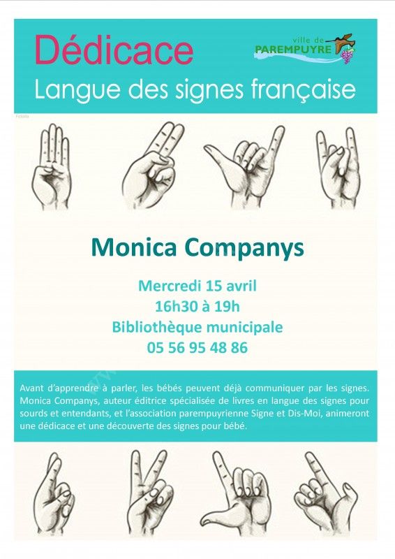Monica Companys, auteur,éditrice spécialisée dans les livres en Langue des Signes Française pour sourds comme pour entendants, et Signe et Dis-moi, association Parempuyrienne d'Ateliers de Signes pour Bébés, animeront une dédicace et une découverte des signes pour tous.