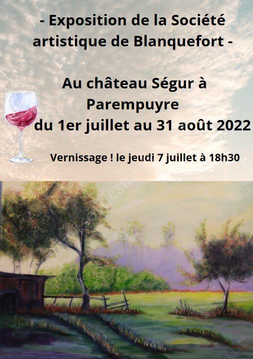 Un vernissage est organisé le jeudi 7 juillet à 18h30. Il sera accompagné des vins du Château et d’un buffet offert par les artistes de la SAB.