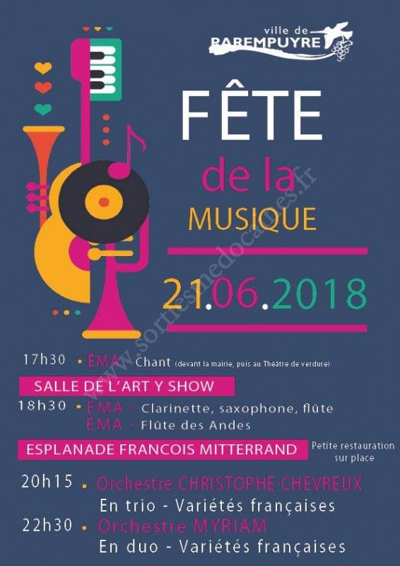 Rendez-vous à partir de 17h30 devant la mairie et en suivant au théâtre de verdure pour un spectacle de chant proposé par l'ÉMA, puis à L'Art Y Show à 18h30 avec 2 concerts proposés par notre École Municipale d'Art (Clarinette, saxophone, flûte / Flûte des Andes).