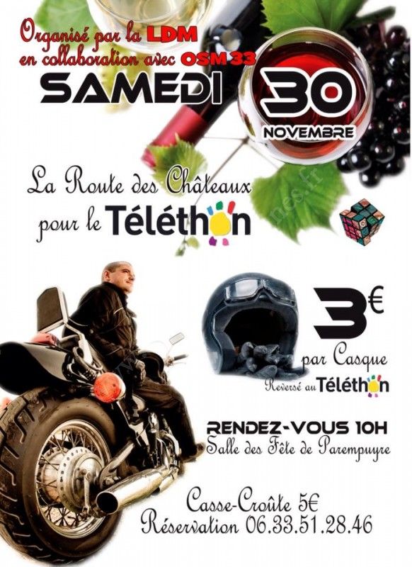 L'ensemble des motards sont invités à participer à une balade organisée par la Ligue de Défense des Motards (LDM), en collaboration avec l'association On Se Mouille 33 (OSM33), au profit du Téléthon 2013.