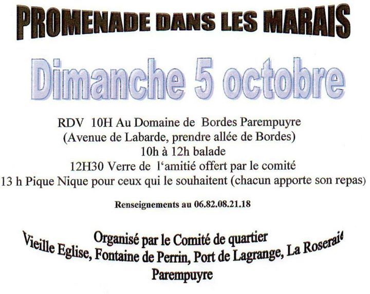 La visite des Marais, organisée par le comité de quartier Port de Lagrange, la Vieille Eglise et Fontaine de Perrin, se tiendra le 5 octobre 2014.