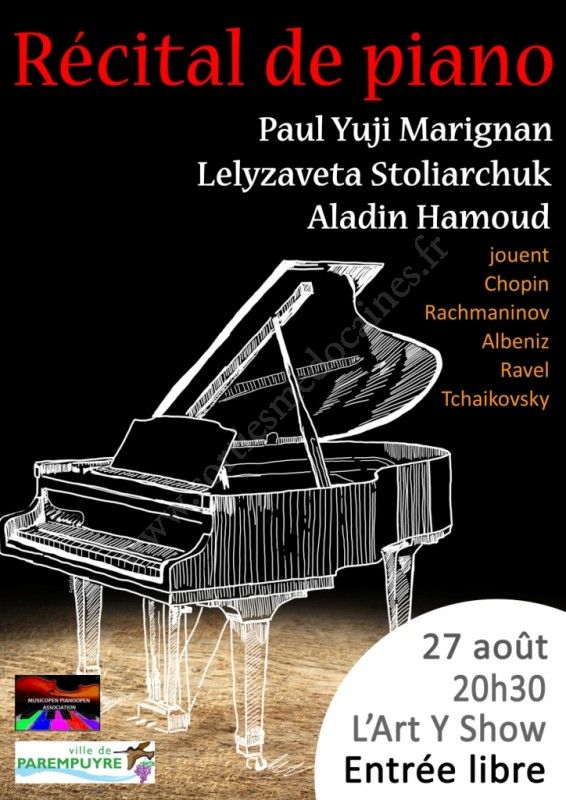 Paul Yuji Marignan, Aladin Hamoud (deux jeunes pianistes de Parempuyre) et Lelyzaveta Stoliarchuk (jeune pianiste ukrainienne) jouent Chopin, Rachmaninov, Albeniz, Ravel, Tchaikovsky… Entrée libre.