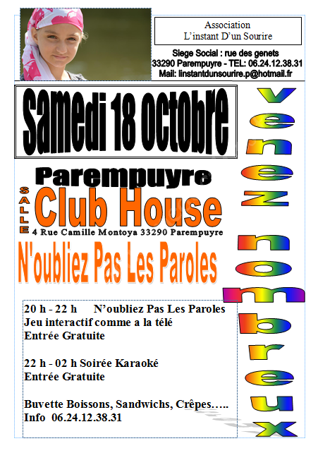 - 20h00 - 22h00 : N’oubliez Pas Les Paroles Jeu interactif comme a la télé (Entrée Gratuite)