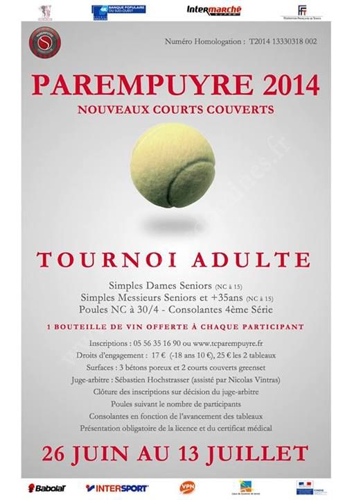 Les inscriptions au tournoi adulte du TCP qui aura lieu du 26 juin au 13 juillet 2014 sont à ce jour ouvertes. Si vous souhaitez vous inscrire, deux solutions s’offrent à vous :