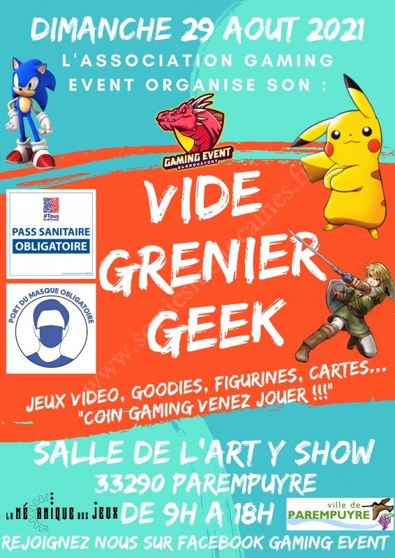 L'association Gaming Event et la ville de Parempuyre organise un vide grenier geek sur le terrain de la salle l'art y show.