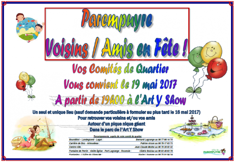 Partager un moment convivial avec ses voisins et/ou ses amis autour d'un pique nique géant que chacun porte. La mairie fourni les tables et les chaises. Stationnement possible. pour les inconditionnels, possibilité de se faire livrer les tables (à parempuyre uniquement) dans son quartier à condition de se signaler avant le 16 mai au plus tard.