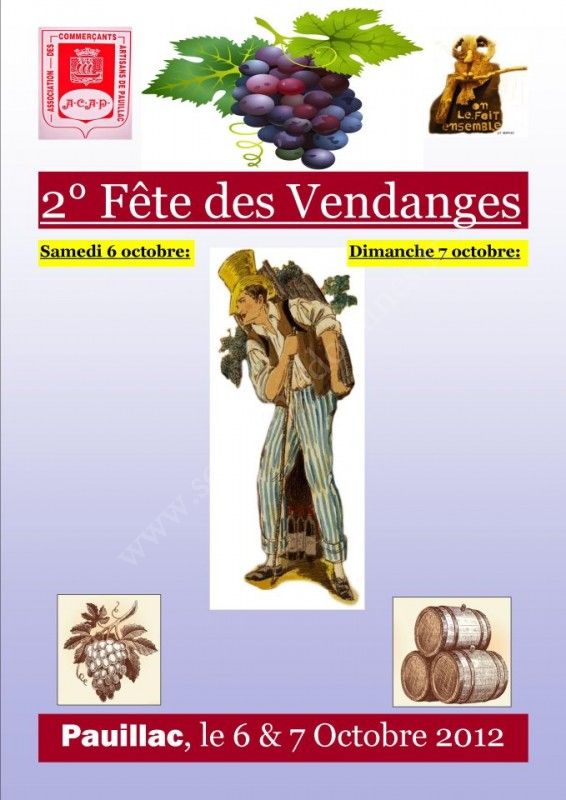 - le soir à la salle des fêtes : élection de la Reine des Vendanges 2012 animée autour d'un défilé et d'une soirée repas (25€/pers. le repas, plus d'informations en cliquant sur ce lien : http://www.sortiesmedocaines.fr/agenda/manifestation/pauillac_election-de-la-reine-des-vendanges_2748.html)