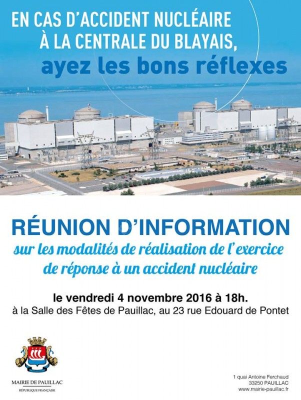 Message de la Mairie de Saint-Estèphe : un exercice de réponse à un accident nucléaire est programmé pour les 23 et 24 novembre 2016.