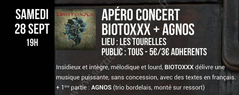 Vous êtes attendus au 1er Apéro concert de la saison vous pourrez apprécier les groupes Biotoxxxx et Agnos en 1ère partie.