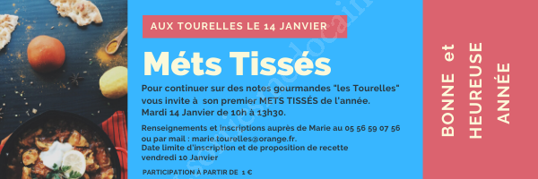 Les Tourelles Les tourelles vous invitent pour le premier "Mets tissés" de l'année, pour commencer 2020 sur des notes gourmandes. On tambouille tous ensemble ! Apprendre à goûter pour les plus petits, faire aimer les légumes, inventer des recettes, grandir dans la joie et le partage.